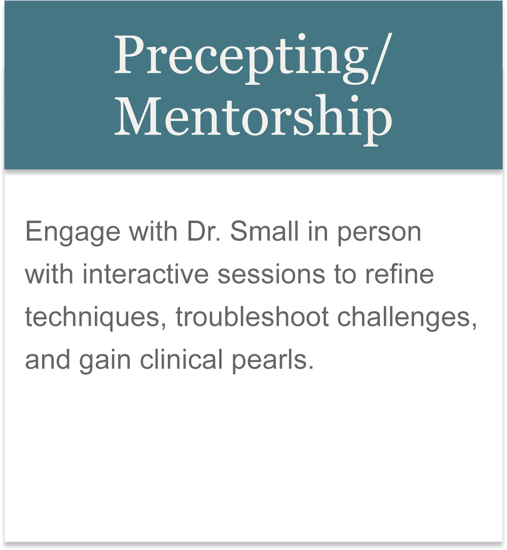 Training doesn’t stop with the cases and courses. RSMD offers support through direct engagement with Dr. Small. Receive practical guidance and learn how to achieve exceptional results through hands-on trainings and 1:1 in-person precepting or mentorship. You won’t be left to figure it out alone. Wherever you practice, you can receive individualized guidance from Dr. Small.